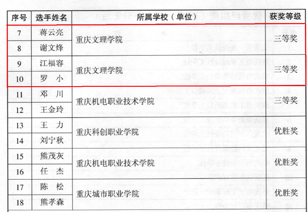 2018年1月2日,重庆市人民政府办公厅以渝府办[2017]191号发文表彰2017年中国•重庆第五届职业技能大赛获奖单位和个人。