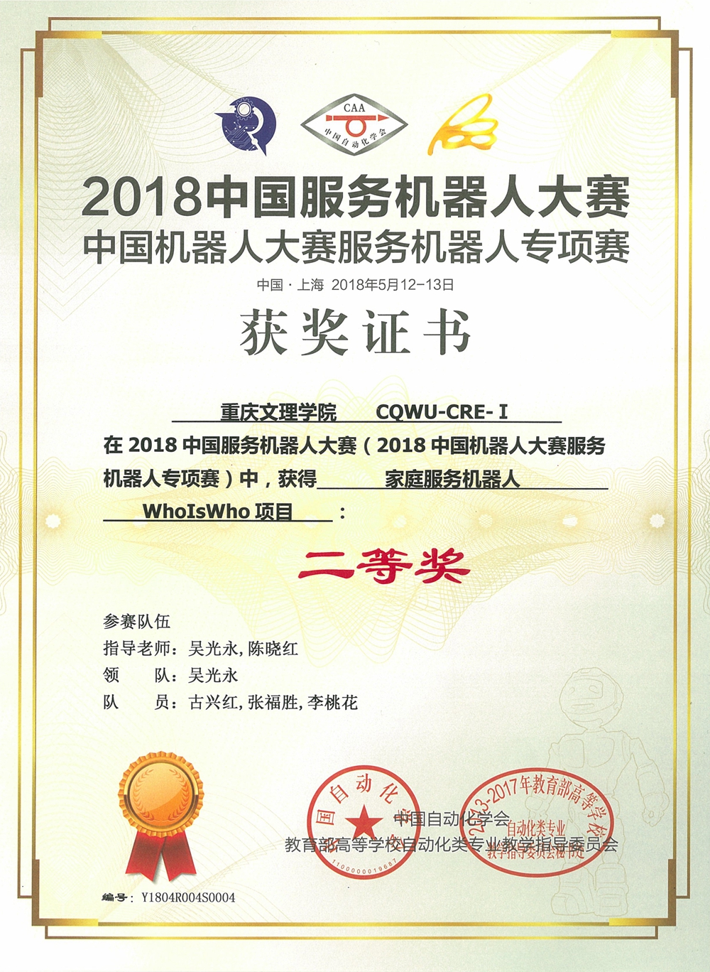 公司派出了由机械电子工程系主任吴光永、专业教师陈晓红带领的3支代表队9名队员参加了家庭服务机器人赛项中9个项目的比赛。经过历时2天、与来自全国70多所高校选手的激励角逐,2015级机械电子工程专业员工韦文、李作棚、2016材料成型及控制工程专业员工朱丽单组成的CQWU-CRE-Ⅲ队成功夺得“泡茶机器人”项目亚军(一等奖)、“人的辨识”项目和“路径规划”项目二等奖。2015级机械电子工程专业员工古兴红、2016级机械电子工程专业员工张福胜、2016级材料成型及控制工程专业员工李桃花组成的CQWU-CRE-Ⅰ队和2015级机械电子工程专业员工裴胜、王兰权、马茂瑞组成的CQWU-CRE-Ⅱ队团队分别获得“WhoIsWho项目”、“Shopping项目”二等奖。其余选手的另外4个项目分别获得三等奖。