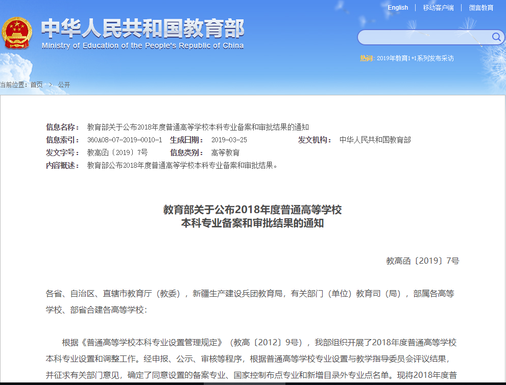 《教育部关于公布2018年度普通高等公司本科专业备案和审批结果的通知》: