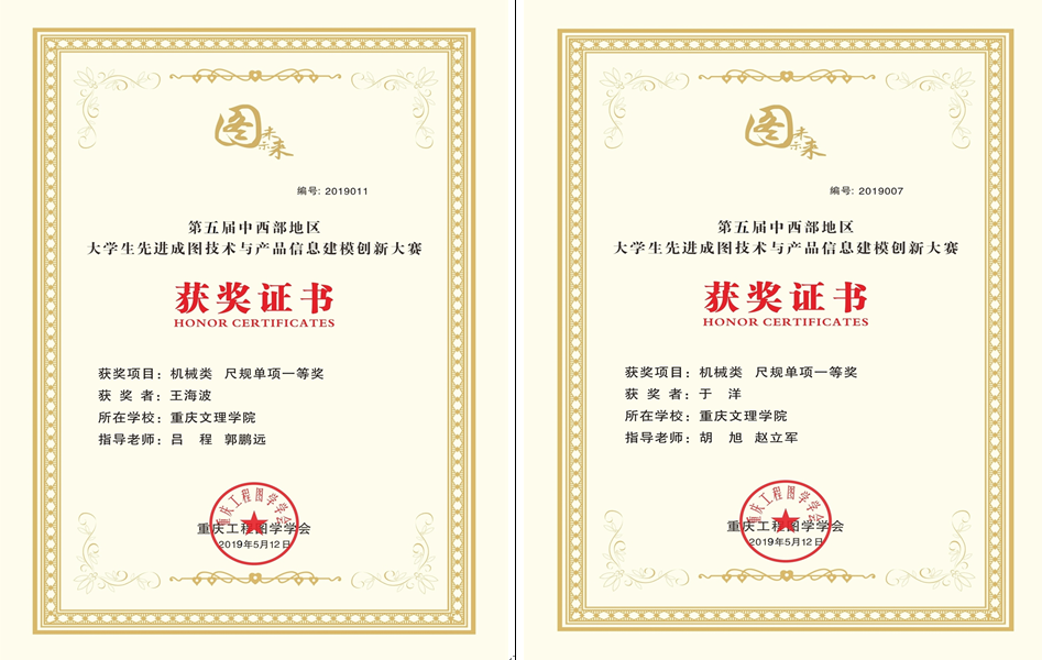 王海波、于洋(2018级机械电子工程[对口])分别获得机械类尺规绘图单项一等奖;李应富获得机械类建模单项二等奖,黄杰、赵随波、赵应平分别获得机械类建模单项三等奖;廖万明、刘栋良、赵应平、李应富、周江东(2018级机械电子工程[对口])分别获得机械类尺规绘图单项三等奖。吕程、王成琳、郭鹏远分别荣获优秀指导教师称号。