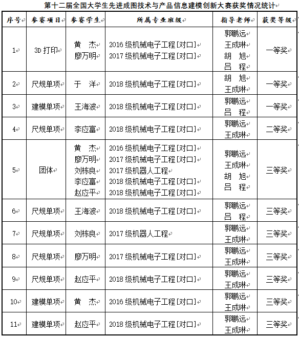 公司高度重视组队参加本次大赛,确定了专门的指导教师团队,并通过“机器人文化节”等形式进行海选,最终从185名报名参赛的员工中选拔出15名选手参加第五届中西部地区老员工先进成图技术大赛,再次择优挑选出7名选手参加全国大赛。经过为期两个月的集中培训,由机械工程系主任胡旭和专业教师郭鹏远带领前往宁波参加本次大赛,最终获得3D打印、尺规、建模3项一等奖,1项尺规二等奖,以及团体、尺规、建模7项三等奖(具体获奖见图表)。尤其是2018级于洋、王海波首次参加全国大赛并获得了一等奖,为其他员工树立了良好的榜样。