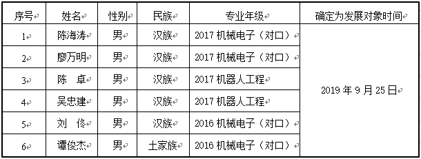 根据《中国共产党发展党员工作细则》的规定和《关于2019年上半年入党积极分子培训和发展党员工作计划的通知》的要求,经入党介绍人推荐,并征求专业教师、辅导员和班级群众座谈会意见,经员工第二支部委员会9月25日开会讨论,拟确定陈海涛、廖万明等6名同学为党员发展对象。现将有关情况公示如下: