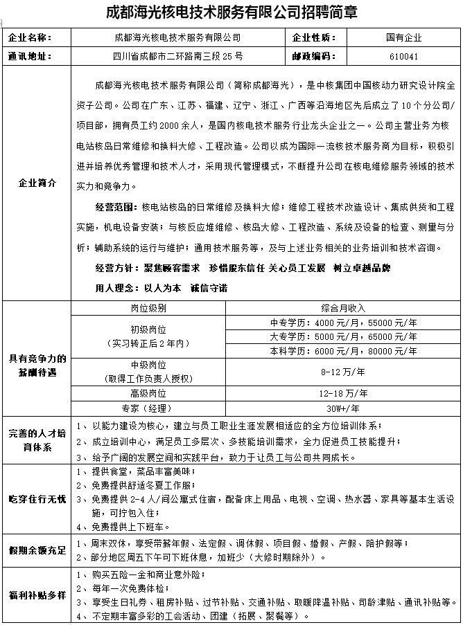 成都海光核电技术服务有限公司招聘简章